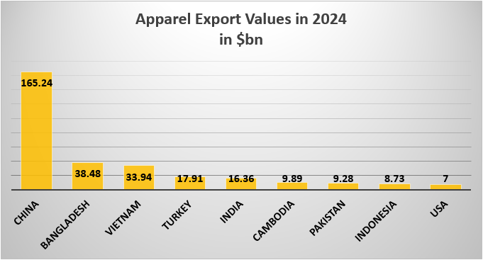 China continues to dominate the market, exporting $165.24 billion worth of apparel with a modest 0.30% growth rate, securing a 29.64% market share. Bangladesh followed with a 6.90% share, while Vietnam climbed to 6.09%, reflecting its accelerating momentum.